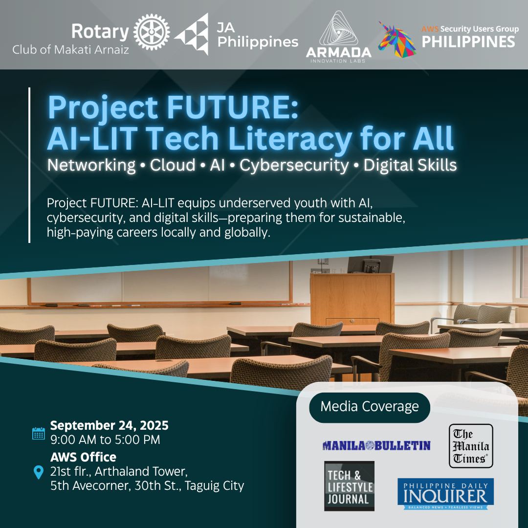AWS BGC OfficeThe first day of Project FUTURE: AI-LIT Tech Literacy for All successfully kicked off on September 24, 2025, gathering students and teachers from City of Mandaluyong Science High School, Mataas na Paaralang Neptali A. Gonzales, and La Huerta National High School. The initiative, hosted by AWS Security Users Group and organized by Armada Innovation Labs […]
